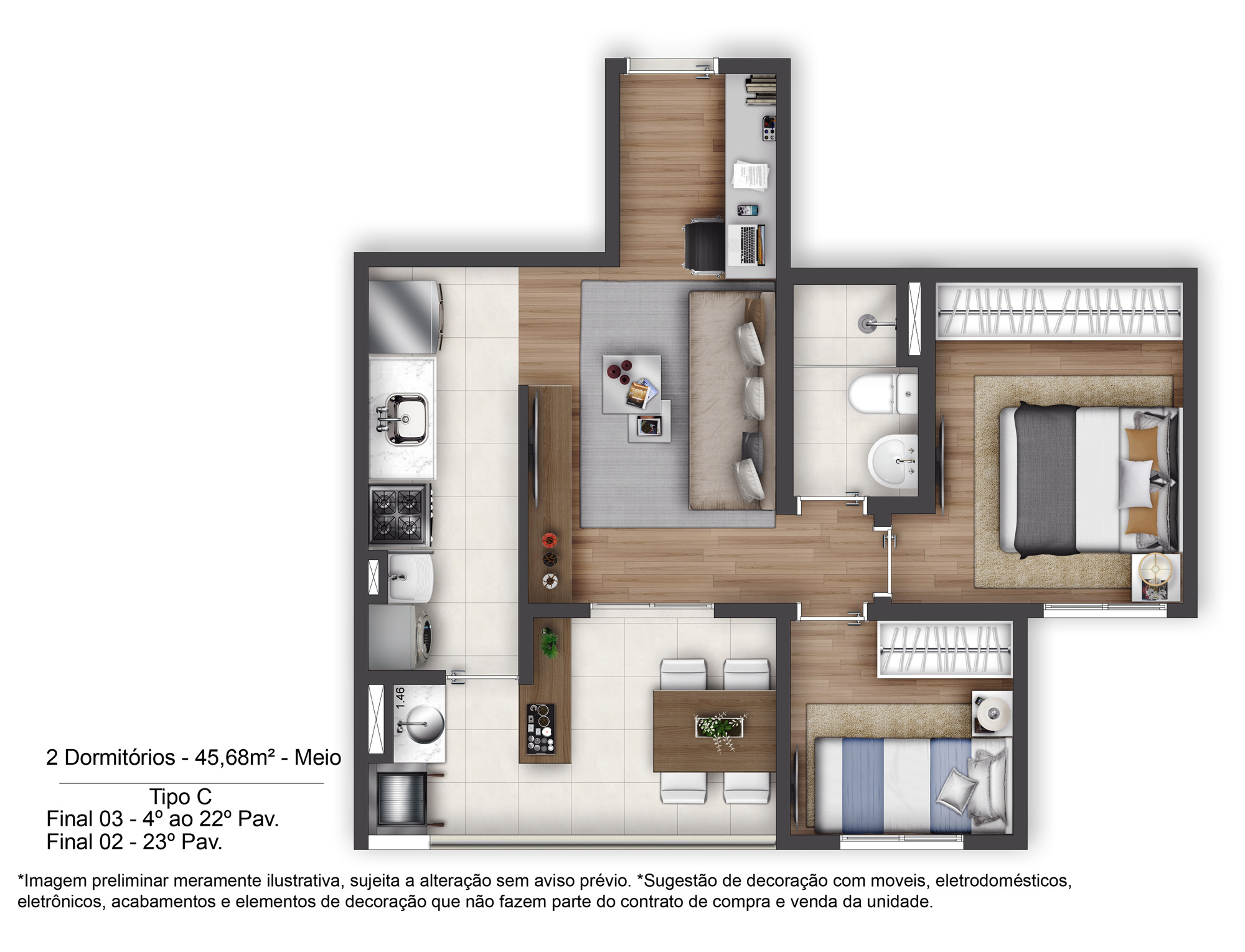 Sujeito a disponibilidade. Faça uma consulta. Atenção: O empreendimento só será comercializado após o registro do Memorial de Incorporação no Cartório de Registro de Imóveis, na forma da Lei nº 4.591/64. Qualquer venda estará sujeita ao pagamento do valor correspondente à intermediação imobiliária, e as respectivas comissões decorrentes deverão ser suportadas pelo comprador. Os instrumentos posteriores a serem firmados pelos clientes prevalecerão sobre quaisquer especificações constantes neste material. Todas as imagens e perspectivas aqui contidas são meramente ilustrativas. Material preliminar sujeito a alterações sem aviso prévio.